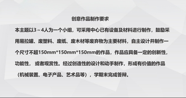 鼓励大家“变废为宝”,利用易拉罐、废塑料等生活废弃物,在150mm的立方空间内,通过巧妙设计打造出独一无二的艺术品或功能装置。