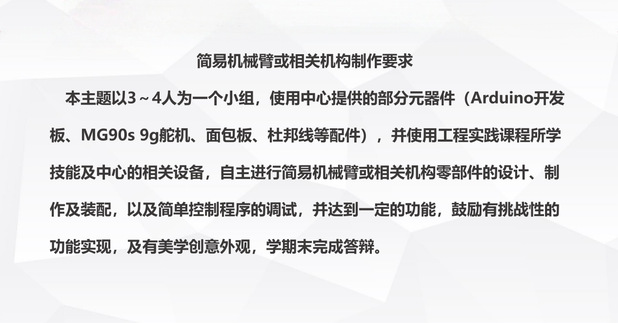 同学们将利用Arduino开发板、舵机等元器件,结合所学技能,设计并组装出兼具功能性与美观性的机械装置。